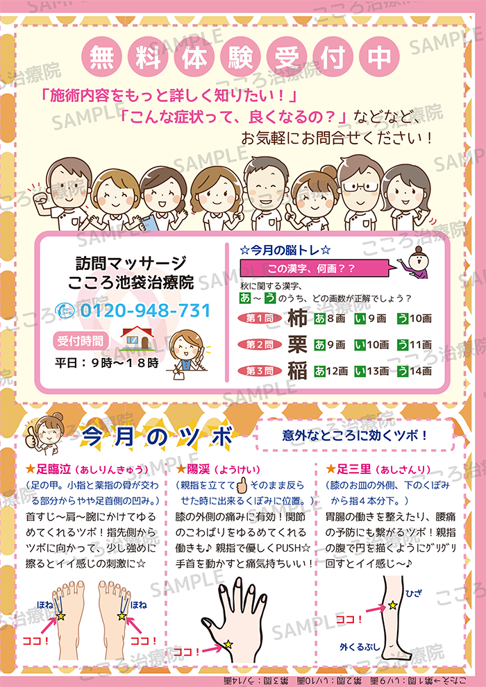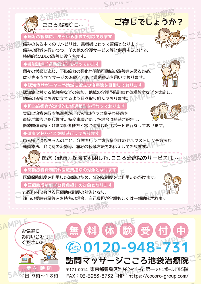 訪問医療鍼灸マッサージこころ治療院は、鍼灸師・あん摩マッサージ指圧師による独自プログラムにてはり・きゅう・リハビリマッサージを提供しています。