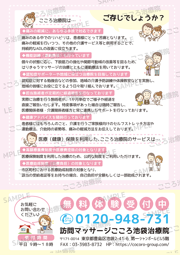 訪問医療鍼灸マッサージこころ治療院は、鍼灸師・あん摩マッサージ指圧師による独自プログラムにてはり・きゅう・リハビリマッサージを提供しています。