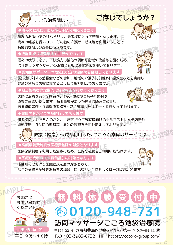 訪問医療鍼灸マッサージこころ治療院は、鍼灸師・あん摩マッサージ指圧師による独自プログラムにてはり・きゅう・リハビリマッサージを提供しています。